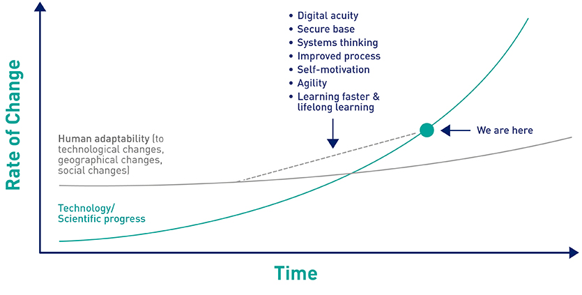 This commentary considers and builds on his thesis at the individual and company levels for now, leaving his community and social/infrastructure themes for a later date. The pace of change – technological (driven by Moore’s law), socio-political and environmental – is outpacing that of the human adaptability to change, and it’s overwhelming.Â