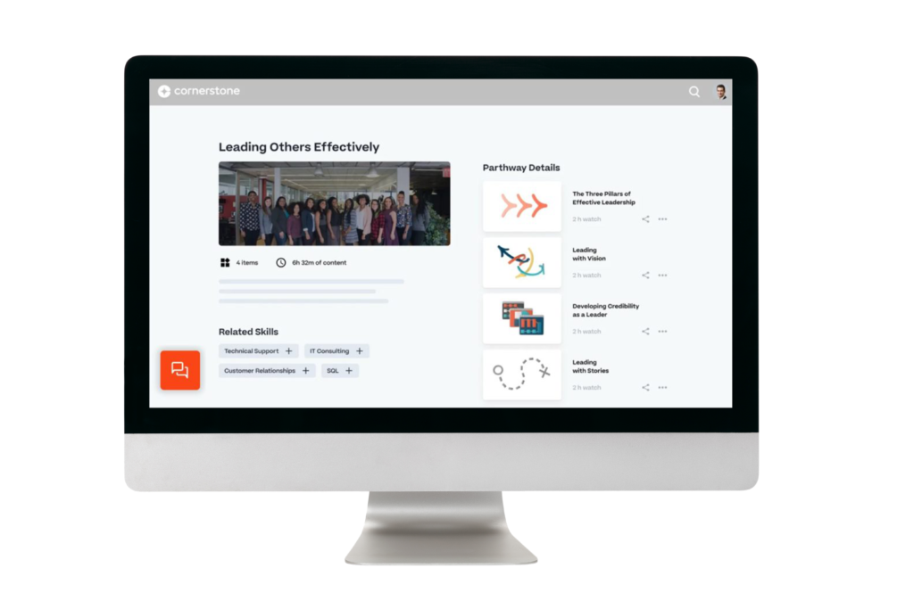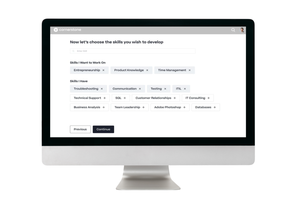 With Cornerstone, your people can see their unique skills profile and create self-driven, skills-based learning paths to suit their career development needs. Using purpose-built AI, Cornerstone guides and curates learning to make self-directed growth more effective.